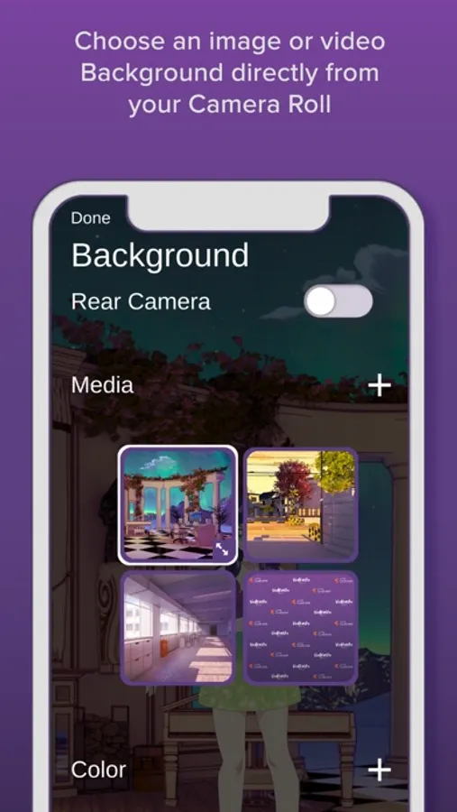 Choose an environment from your Camera Roll, or enable the rear facing Camera to overlay your characters upon the real world.