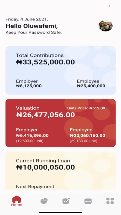Home Page: This provides members with a summary of Contributions, Current Valuation, Running Loans, Portfolio Type and Current Interest Rate for New Loan applications.