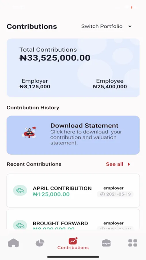 Contributions: This allows members to view employee and employer contributions in both Value and Units. In addition, members can make a request for a portfolio switch.
