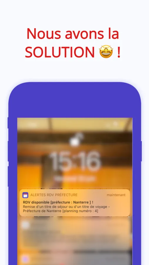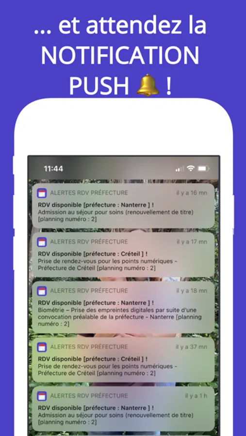 Vous vous abonnez à un motif dans une préfecture donnée (par exemple : Naturalisation à la préfecture de Nanterre), et nous vous enverrons une notification PUSH dès qu'un créneau est disponible.