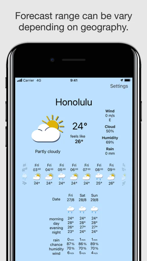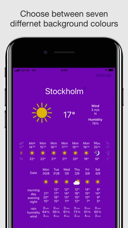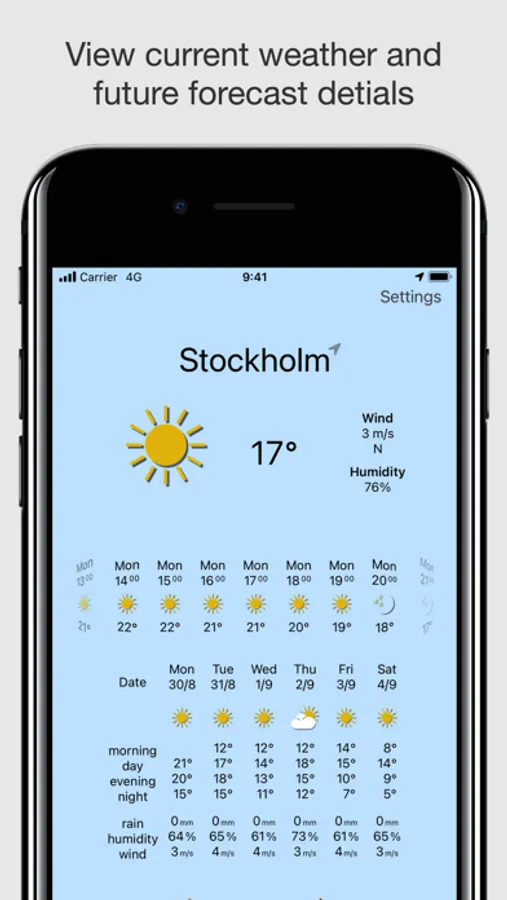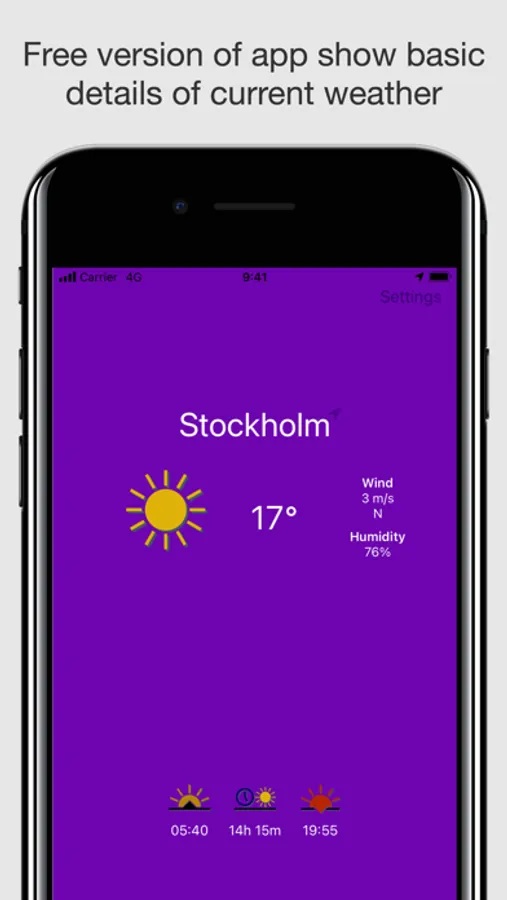 The app is free. The basic version shows the latest actual weather reading, along with weather type, temperature, precipitation, humidity, wind, as well as sunrise and sunset hours at the chosen location. Forecasts are unlocked through a in-app PLUS subscription. The first few days, or full week if you choose a full year subscription, are a free trial period allowing you to try out all the features of the app at no cost.