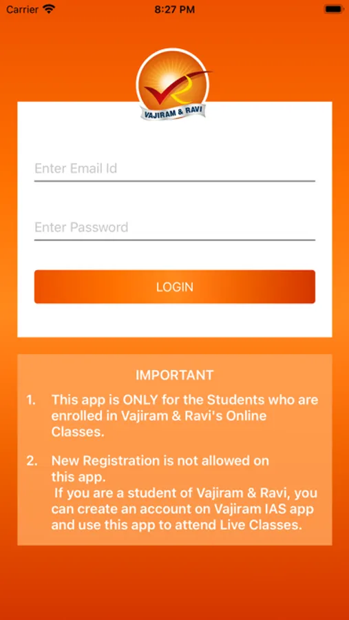 New Registration is not allowed on this app. If you are a student of Vajiram & Ravi, you can create an account on Vajiram IAS app and use this app to attend Live Classes.