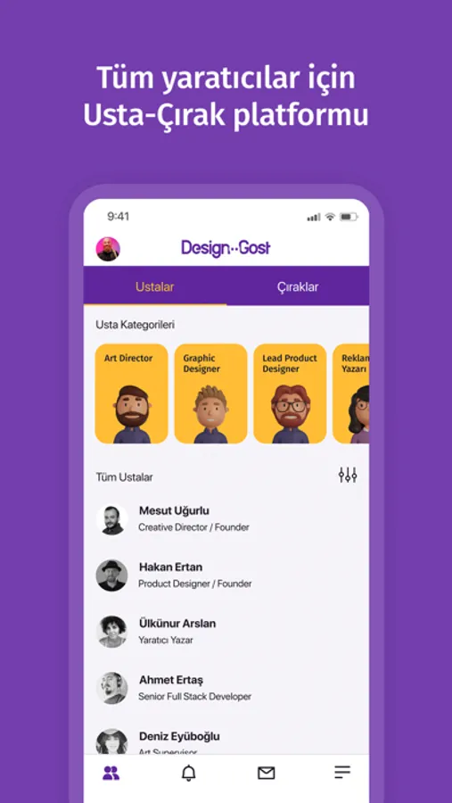 Yaratıcı disiplinlerin bir arada üreterek geliştiği platformumuz tamamen ücretsizdir. Çırak hesabını oluşturduktan sonra kariyerinde parlamana yardımcı olacak farklı disiplinlerden Ustalar seçebilirsin.