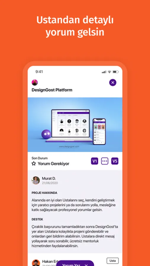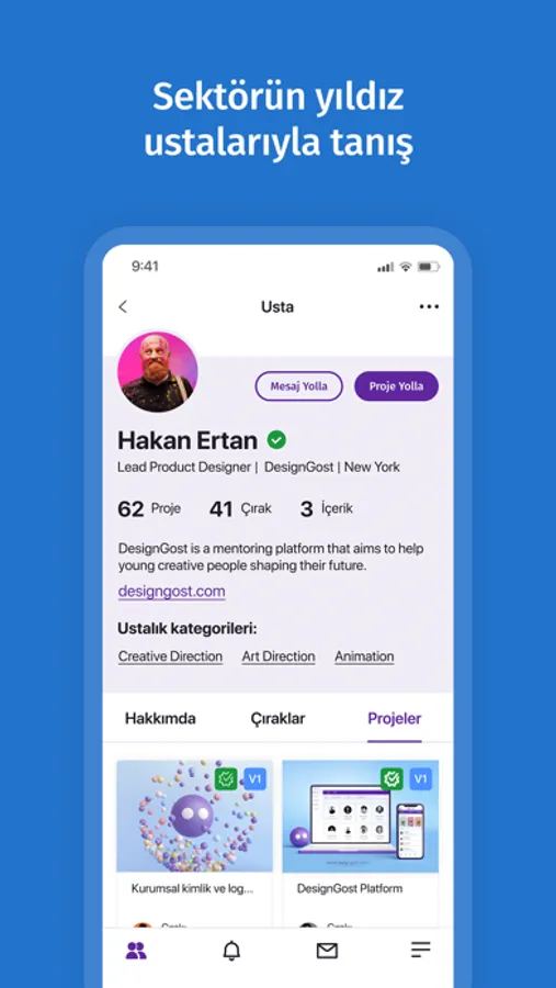 Çıraklık başvurunu tamamladıktan sonra DesignGost'ta yer alan Ustalara kolaylıkla projeni gönderebilir ve onlardan geri bildirim alabilirsin. Ustalara direkt mesaj yollayarak soru sorabilir, ücretsiz mentörlük hizmetinden faydalanabilirsin.