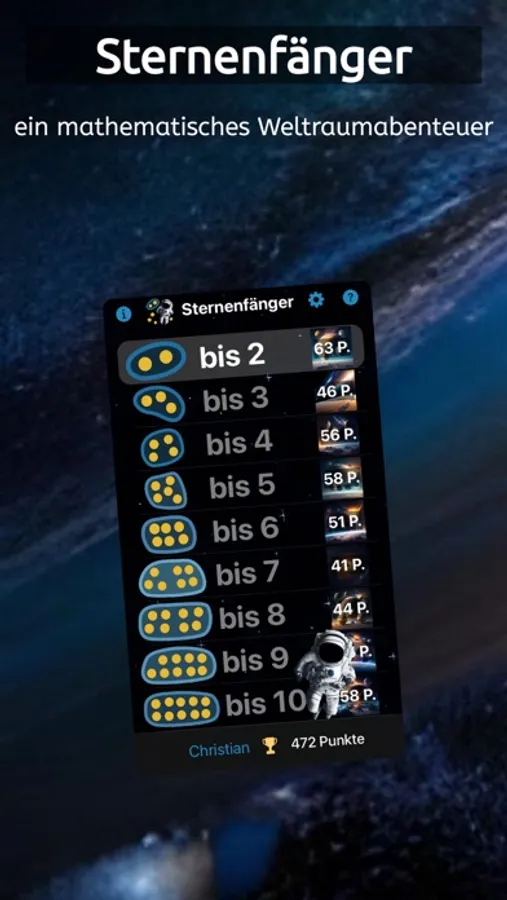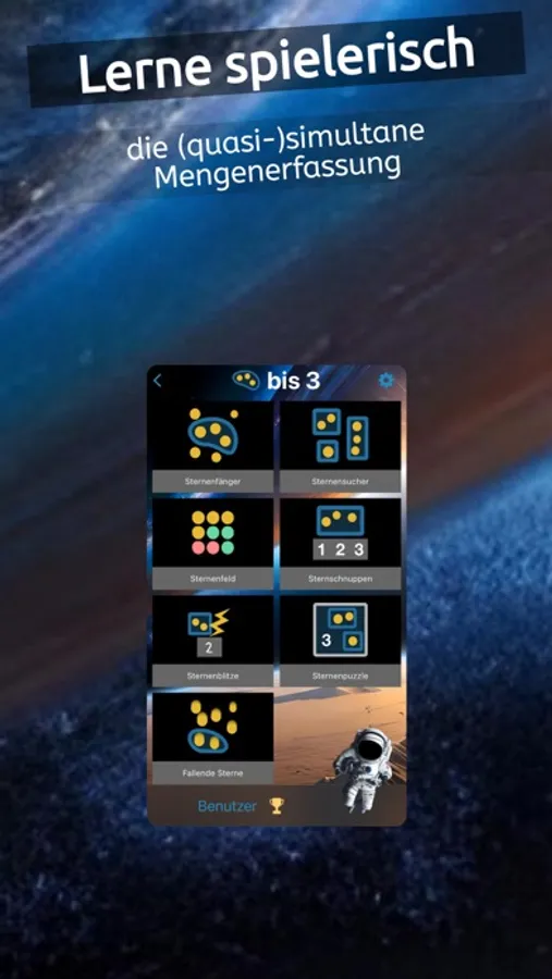 Mathematik als spannendes Weltraumabenteuer! Sternenfänger ist eine pädagogisch fundierte App, die Kinder auf spielerische Weise dabei unterstützt, ihre Mengenerfassungsfähigkeiten zu verbessern. Mit acht interaktiven Spielen in unterschiedlichen Schwierigkeitsgraden und Zahlenräumen, von der schnellen Erfassung von Sternengruppen bis hin zum blitzschnellen Finden passender Zahlen, werden Kinder dazu ermutigt, Mengen blitzartig zu erfassen und effektive Mengenerfassungsstrategien zu entwickeln.