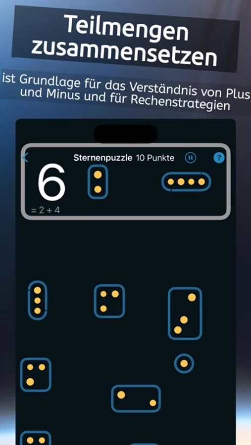 Die App bietet eine Reihe von Übungen, bei denen Kinder Sterne am Himmel einfangen, Zahlen zu passenden Sternenmengen zuordnen oder größere Mengen in Teilmengen zerlegen. Jedes Spiel fördert das schnelle Erkennen und Erfassen von Mengen, was dazu beiträgt, dass Kinder effizientere Mustererkennungstrategien entwickeln und ein tieferes Verständnis für mathematische Konzepte erlangen. Das Schnelle Sehen ("Blitzblick") von Mengen ist eine der wesentlichen Grundlagen für die Entwicklung nicht-zählender Rechenstrategien. Kinder, die simultan oder quasi-simultan Mengen schnell ohne nachzuzählen erfassen können, entwickeln einfacher und schneller effiziente Rechenstrategien und verstehen Mathematik insgesamt besser.
