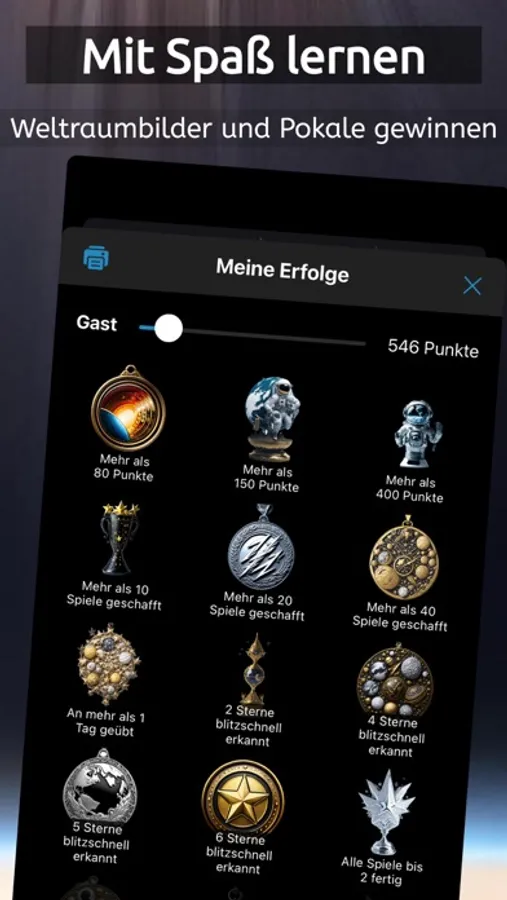 Die motivierende, aber dennoch auf den Lerninhalt fokussierte Struktur der App motiviert die Kinder dazu, ihre Fähigkeiten immer weiter zu verbessern. Für jedes erfolgreich gelöste Spiel erhalten sie Punkte und können Weltraumbilder und Erfolgsabzeichen sammeln.