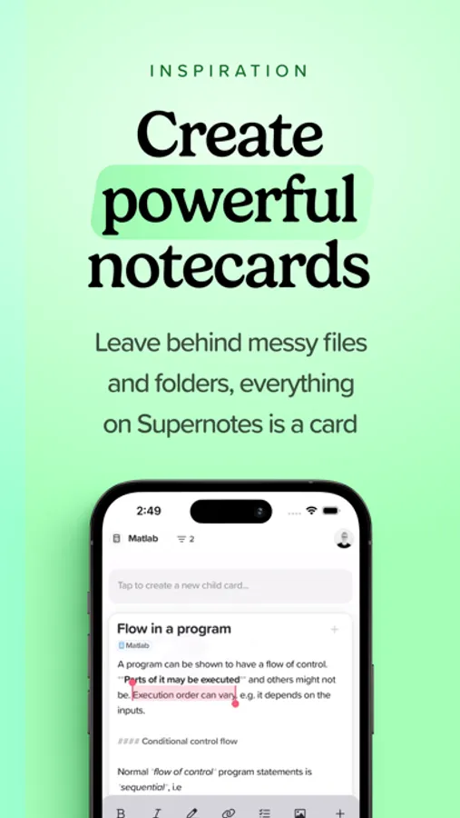 Leave behind messy files and folders, and instead create, edit and share notecards. The Supernotes' editing experience combines the best of Markdown and LaTeX to effortlessly enable formatting options like headings, bold and italic text, lists, maths equations, code snippets, and more.