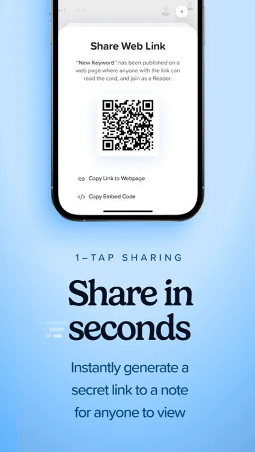 Sharing your notes is a breeze with Supernotes. Instantly generate url links with QR codes for your individual notecards, making it incredibly convenient to share them with others. Simply share the link or scan the QR code, and that note will be instantly accessible to anyone (even if they don't have Supernotes)!