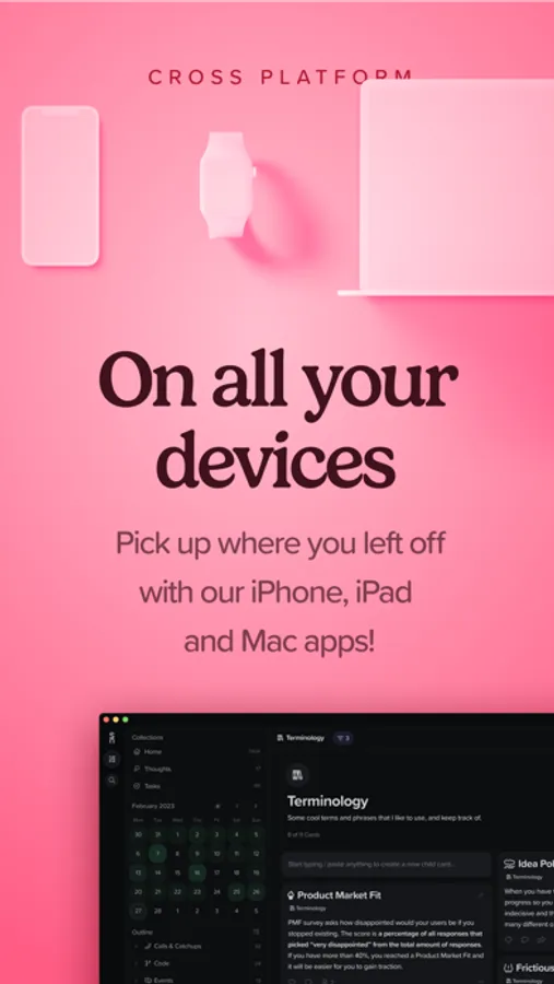 Pick up where you left off with our iPhone, iPad and Mac apps. Keep taking notes wherever you are, even if your connection drops with seamless offline support.