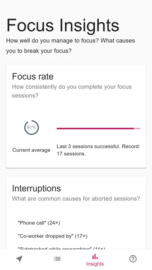 If you do let yourself get distracted, quickly note what caused it. Every once in a while, take a look at your collected notes. Focus Trainer will show you the most common reasons for interruptions. Tackle those first.