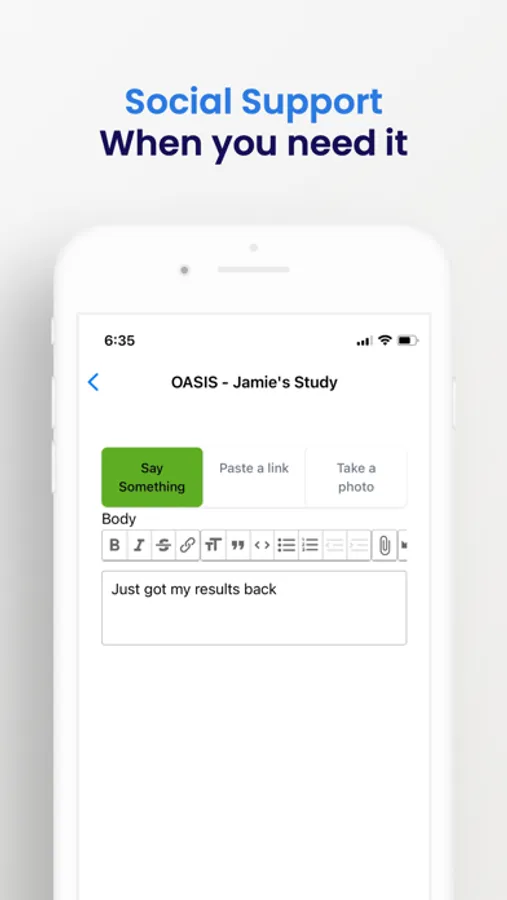 OASIS consists of evidenced based symptom management educational content, a health tracking feature to record symptom and use of strategies, a peer group message board to connect with other study participants, and one-to-one messaging with a research nurse.