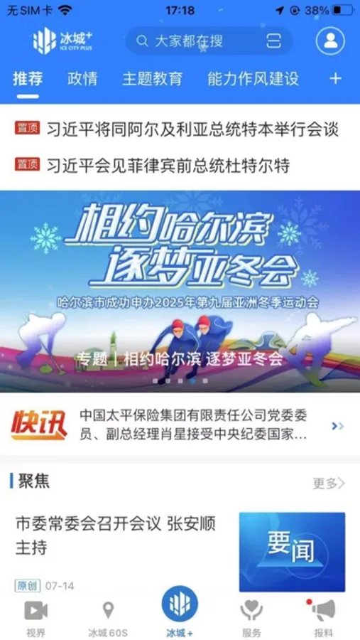 “冰城+”客户端现设新闻、视界、志愿者、服务、发现等特色专区,开通推荐、政情、城事、冰城号、直播、视频、天下、旅游、康养等频道,全力打造区域性生态级移动全媒平台,深耕冰城,影响龙江,辐射全国。