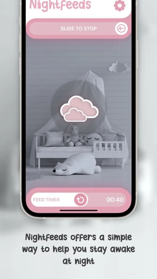 Nightfeeds offers a simple way to help you stay awake at night. You choose how often you want the Nightfeeds alert to go off. When the alert goes off, just tap on the cloud to confirm you're awake, and the alert is reset.