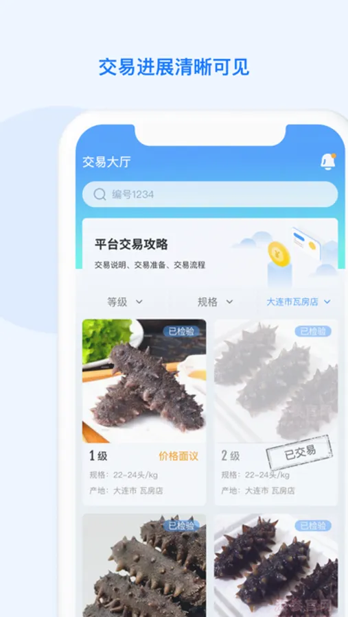 交易大厅:聚合辽参的上下游企业,通过标准化的质检、分选及评估,提供真实有效的海参产品信息,并通过专属经纪人,为交易提供可靠的保障。