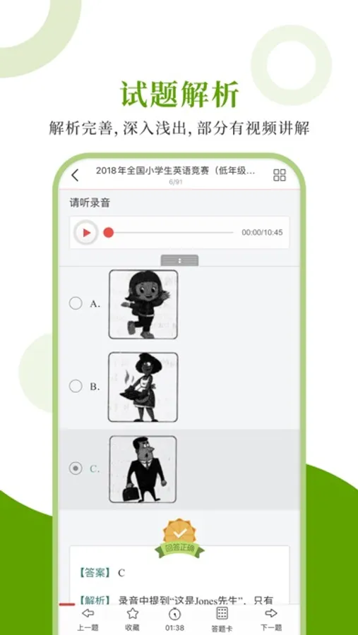 专为全国小学生英语能力测评考试精心准备的考试配套题库,每一道试题都有答案解析,为考试提供了充分的复习准备,可随时随地学习练习,支持手机、平板多端同时使用。