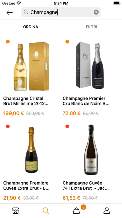 Acquista in offerta i migliori vini italiani, champagne francesi e distillati da tutto il mondo e ricevili in 48 ore in tutta Italia. Troverai più di 2000 etichette selezionate tra le più importanti cantine italiane e piccoli produttori artigianali, la spedizione avviene in 24/48 ore in tutta Italia ed è gratis per ordini da 49,90€, utilizziamo packaging brevettati anti-rottura per il trasporto di bottiglie di vetro, ogni giorno ci sono nuove offerte con sconti fino al 40% e prevendite sui vini italiani più prestigiosi e rari, abbiamo più di 6000 recensioni certificate con il 99% di clienti soddisfatti.