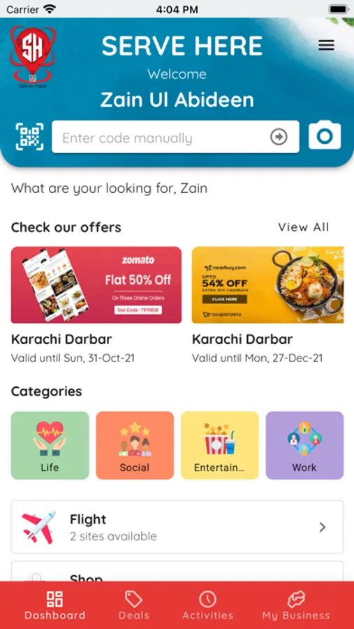 Server here also provide option for customer to scan QR code of all our sub apps and general codes. Customers can create account as partner with this app. Partner can register business in the business listing, can create personal and business cards as well.