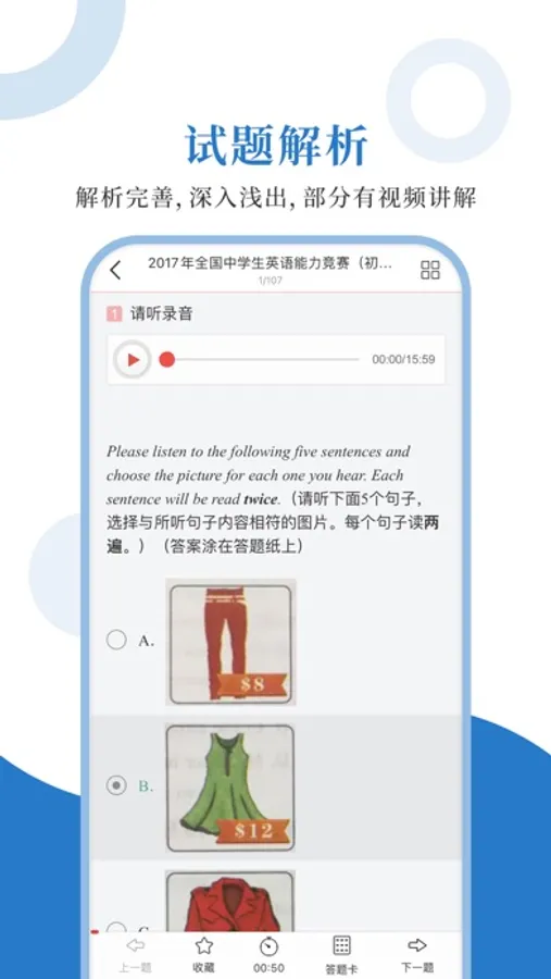 专为全国中学生英语能力测评考试精心准备的考试配套题库,每一道试题都有答案解析,为考试提供了充分的复习准备,可随时随地学习练习,支持手机、平板多端同时使用。
