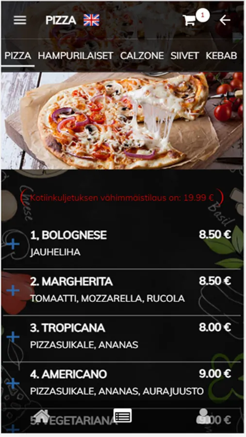 pizzat suoraan listasta, erilaiset valkosipulileivät tai extratäytteet ja annoksen kylkeen valittava juoma – tai
