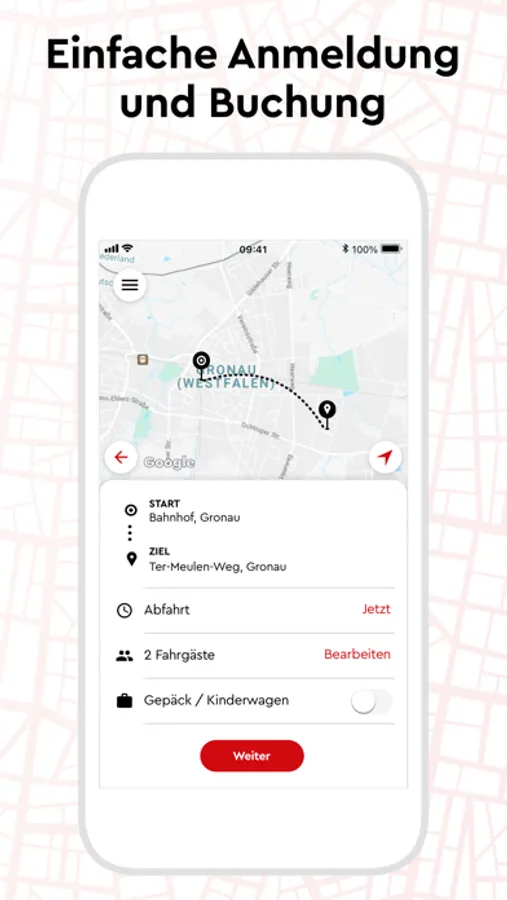 - Barrierefrei: Du bist auf einen Rollstuhl oder einen Rollator angewiesen? Klick einfach in der App auf das entsprechende Feld und wir schicken dir ein geeignetes Fahrzeug. Selbstverständlichen helfen unserer Fahrer gerne beim Ein- und Ausstieg!