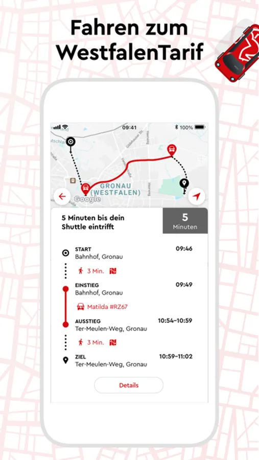 - Live-Auskunft: Wenn dein Fahrzeug unterwegs ist, kannst du live in der App auf einer Karte verfolgen, wo es sich gerade befindet und wann du abgeholt wirst. Und wenn es doch mal zu unerwarteten Verzögerungen kommen sollte, informieren wir dich selbstverständlich per Push-Nachricht!