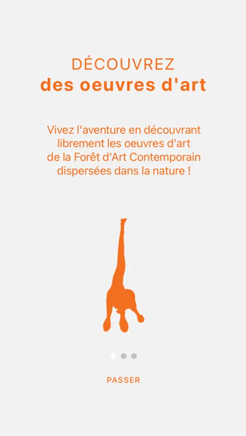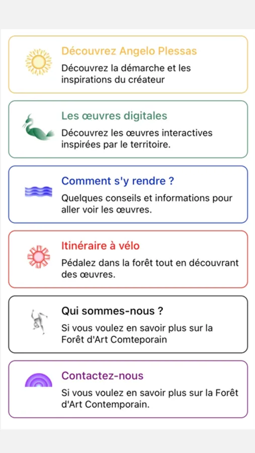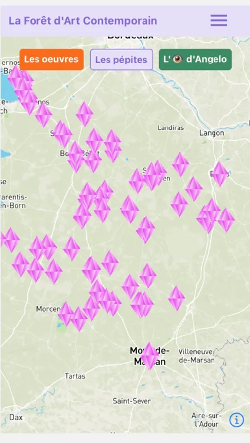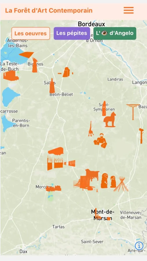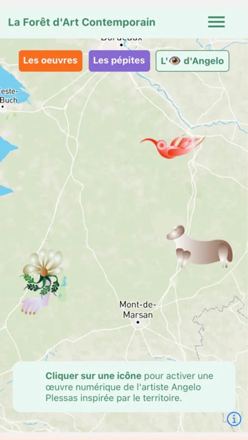 Tout d’abord une carte, qui répertorie l’ensemble des œuvres de la Forêt d’Art Contemporain avec les informations correspondantes : l’artiste, le titre de l’œuvre, un texte explicatif, ainsi que la géolocalisation de l’œuvre.