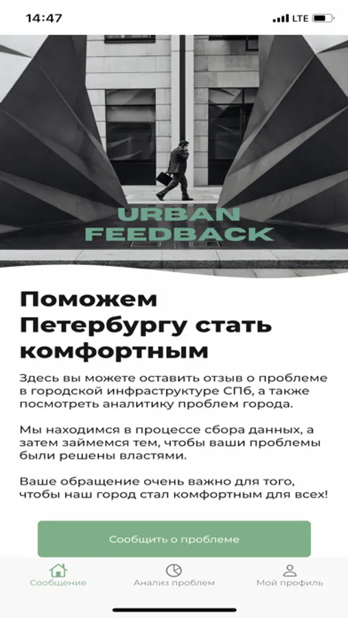 Приложение для сбора обратной связи от горожан насчет проблем городской среды. Оставляйте сообщение о проблемах в городе, и ваша активность поможет сделать город более приятным для жизни!