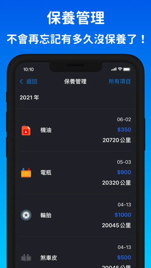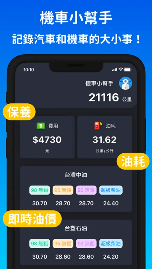 「機車小幫手」是一款專為愛車族設計用來管理汽車和機車大小事的小工具,在這裡您可以透過報表來清楚的觀測到油耗趨勢的變化,再也不會忘記上次是什麼時候換過某個零件,還有即時油價讓您掌握最佳的加油時刻,原來保養車輛也可以那麼簡單,現在就開始使用「機車小幫手」來呵護您的愛車吧!