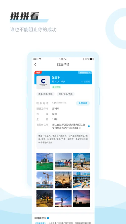 拼拼看是一个衣食住行综合性服务平台,实时匹配人与商户,解决大家的日常需求,工人可以找工作,工厂可以招工人,工厂厂房出租,搬家设备搬运,应有尽有!