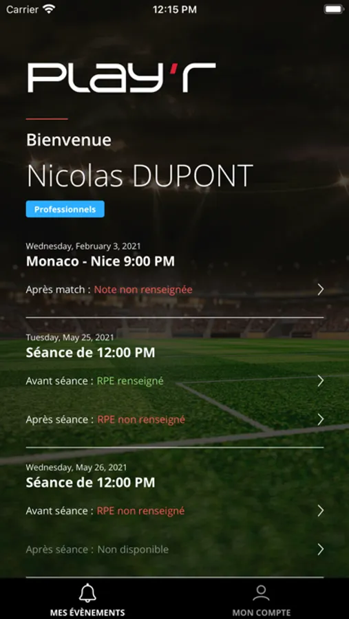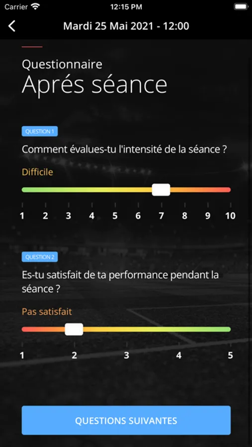L’application permet, pour les utilisateurs enregistrés et validés, de faire parvenir au staff sportif leurs ressentis physique et mentale d’avant et d’après séances, ainsi que les après-matchs.