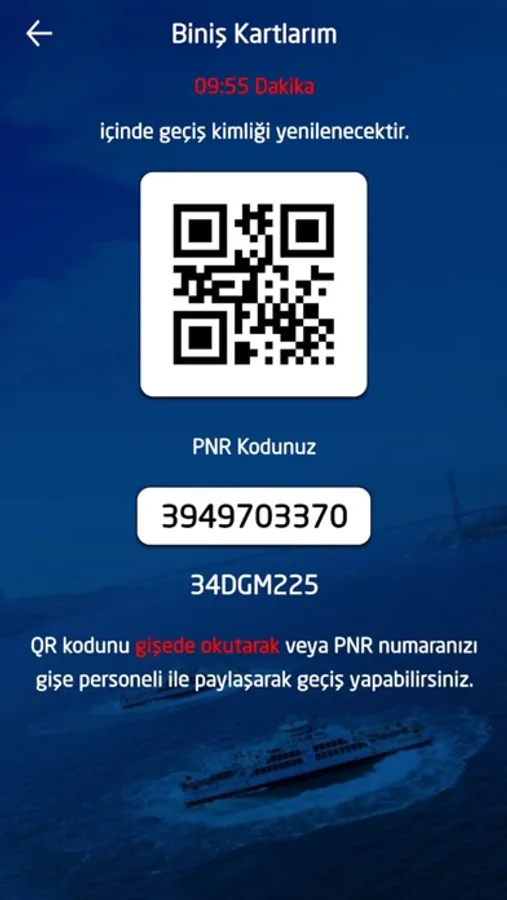 Uygulama üzerinden aldığınız biletlerin bir sefer günü ve saati bulunmuyor. Terminallerimizde gişelerimize ulaştığınızda daha önce almış olduğunuz biletinizin biniş kartına tıklayarak açılan kare kodu okutup gemiye biniş yapabiliyorsunuz.
