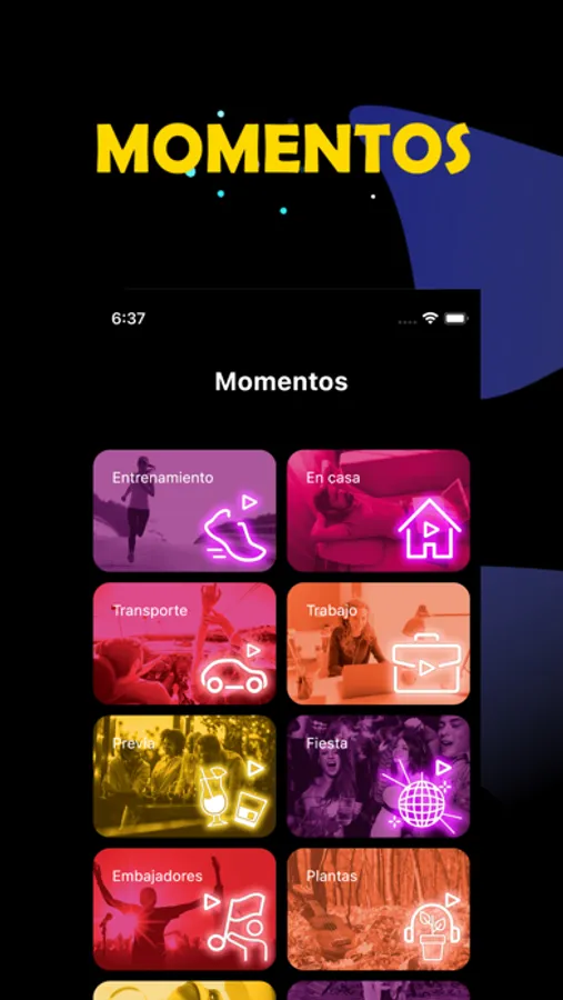 Solo basta con hacer clic para disfrutar tus momentos favoritos como: Entrenamiento, En casa, Transporte, Trabajo, Previa, Fiesta, Karaoke, Embajadores, Plantas, Mascotas, Musicoterapia, Relax.