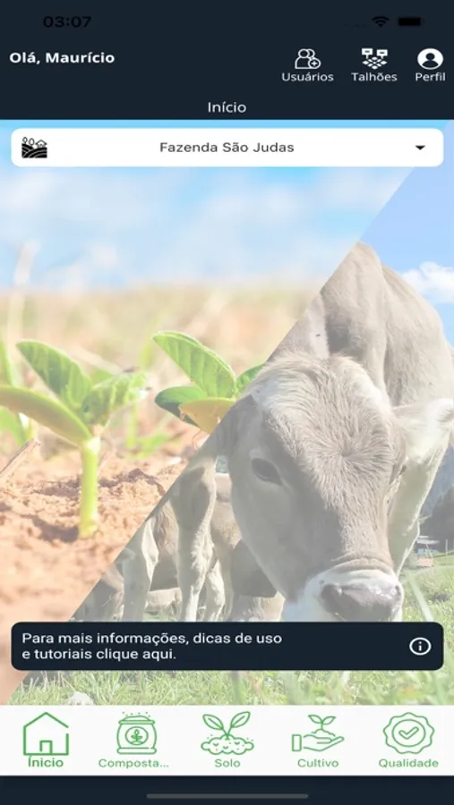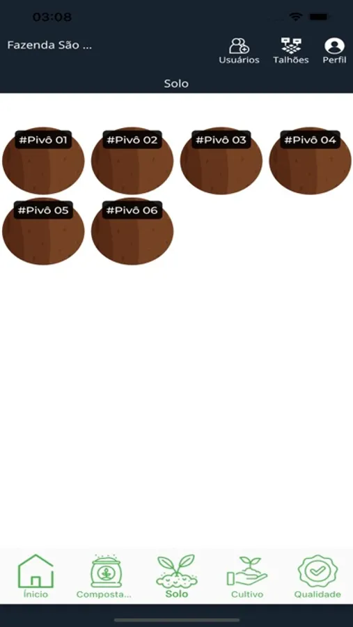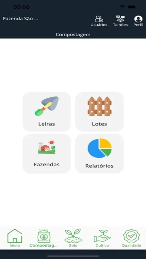 Inicialmente o aplicativo permite o acompanhamento do processo de compostagem. Para tal é possível realizar o cadastro das leiras de compostagem, usuários, fazendas e lotes.