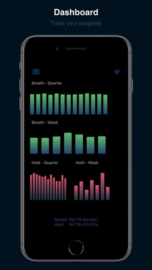 - Track the total time of breathing practiced and breath holds