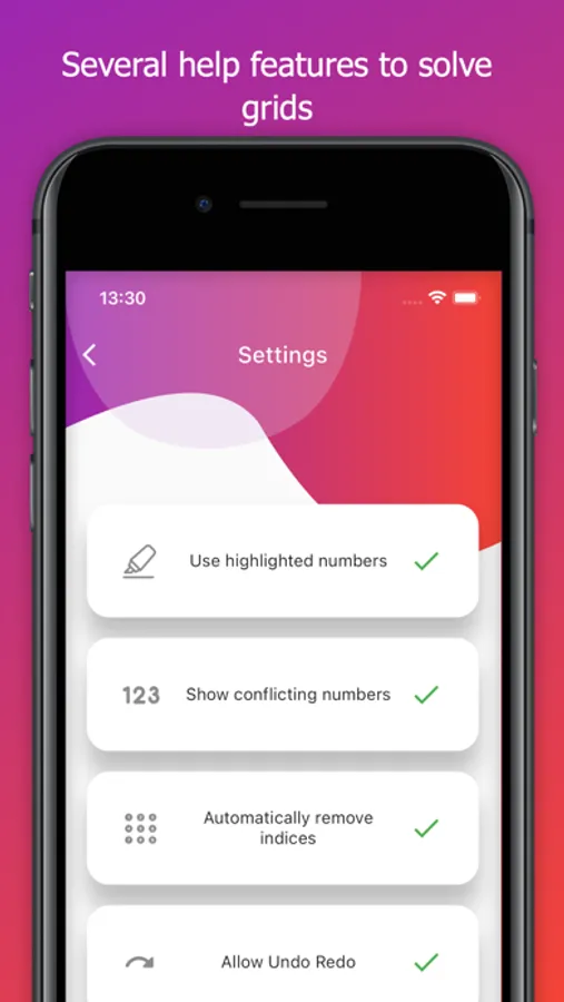 This app is made to make you life easier and provides multiple features like Undo/Redo buttons, highlight selected numbers, highlight conflicting number and even indices that disappear automatically.