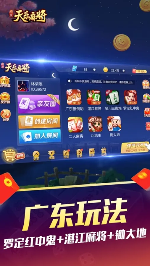 广东粤西湛江吴川本土手机麻将《天乐麻将》 ,天乐麻将拥有多种广东本土正宗麻将玩法,包括:吴川麻将、0759湛江麻将、吴川三脚鸡、湛江麻将、二人麻将、罗定红中鬼、罗定麻将、广东麻将、广东推倒胡、锄大地、斗地主等玩法。