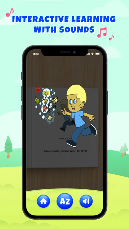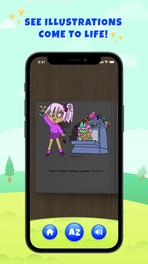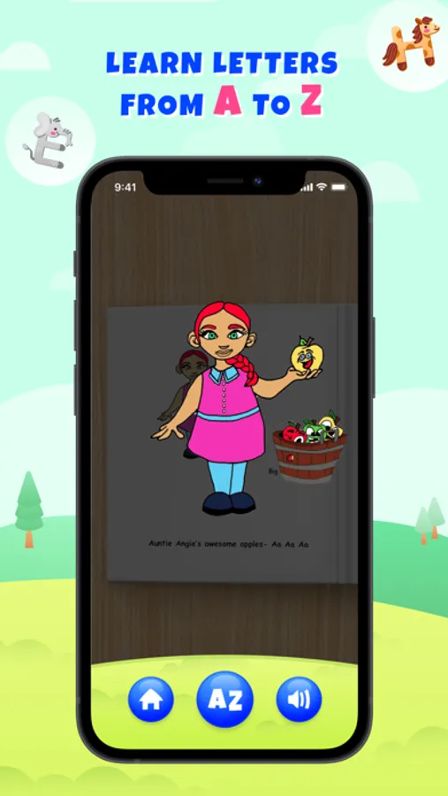 The narration of the book will immediately begin while scanning the front, back covers, and the intro page. Please push the Icon AZ to continue the Narration for the pronunciation of each letter.