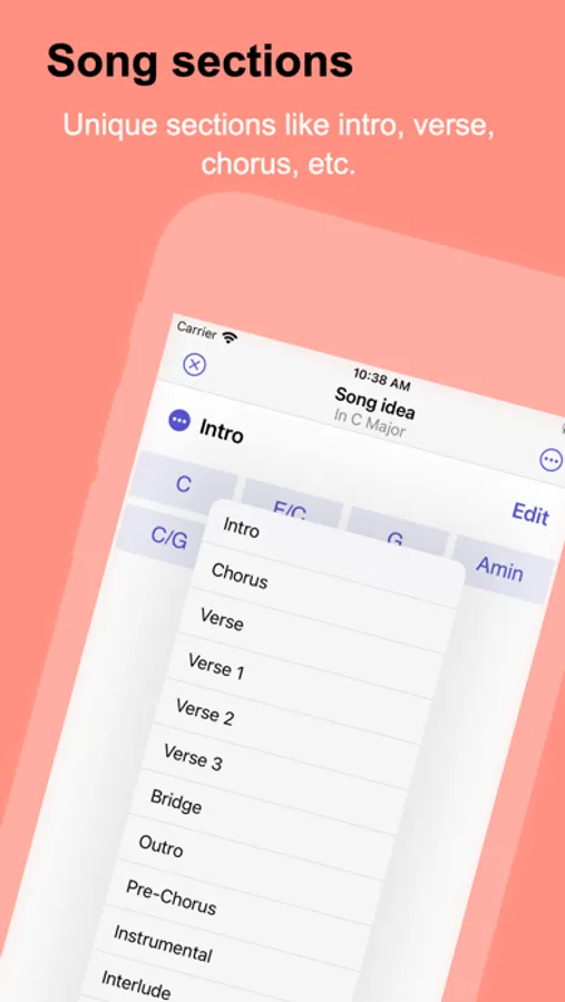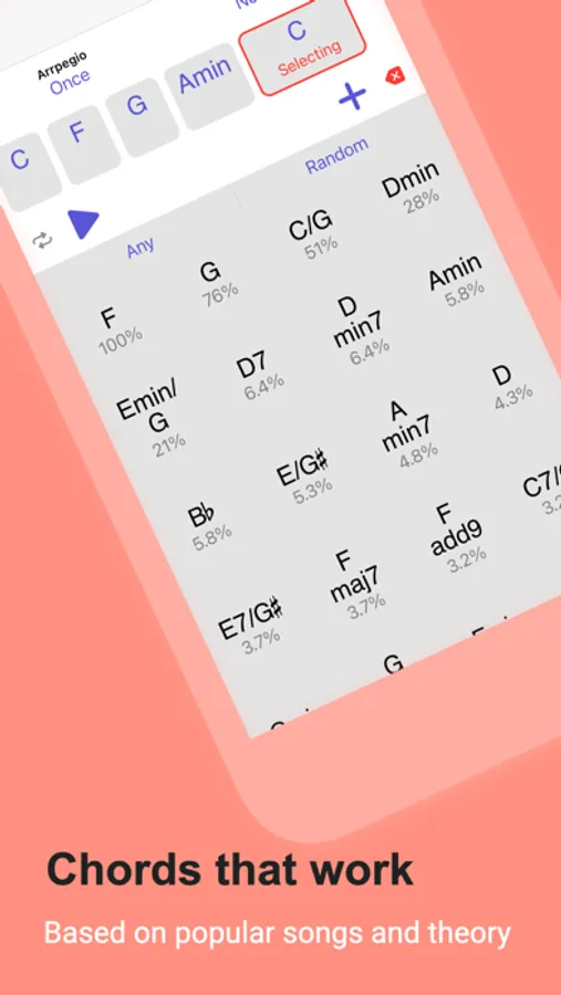 You start by creating a song file. Adjust song tempo, key, and scale. Add one or multiple song sections (like Intro, for example). The first chord of the section will be suggested. After that, all suggestions will be based on the last chord in the section. In order to have smoother chord progressions app automatically supports inverting chords for the best voice leading. You can disable this feature in settings.