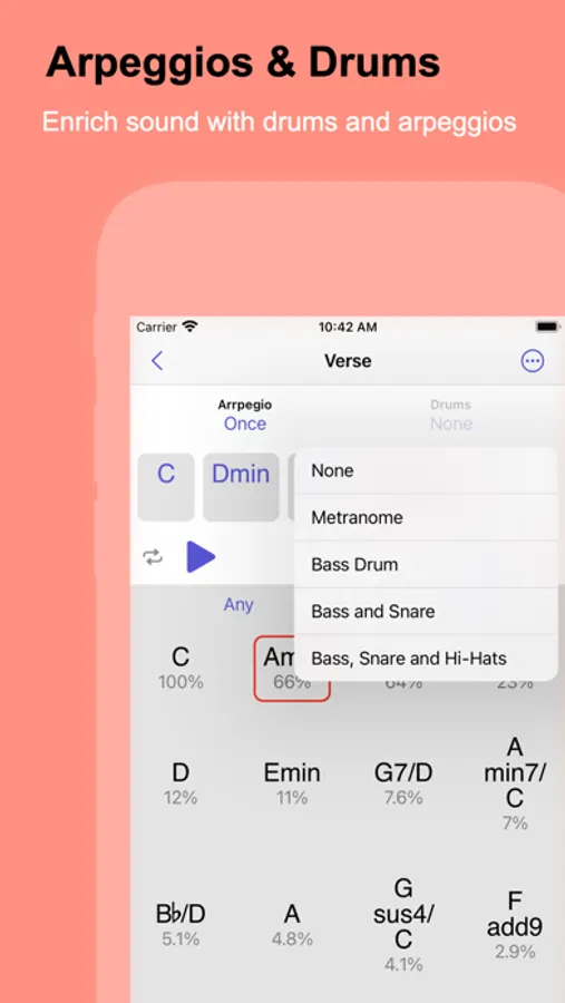 In order to make your song sound richer, you can change the default arpeggios and also choose to from different drum patterns.
