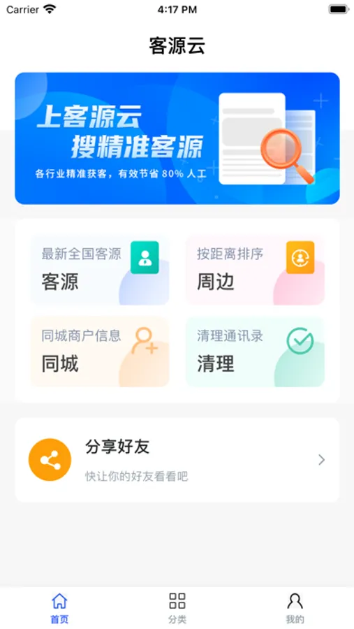 本应用是一款客源拓展工具,用户可以通过合法渠道搜索全国各行各业客源,也可以搜索附近商家。用户可以对搜索到的内容进行表格分享或存储到通讯录,可以方便快捷联系到商家。