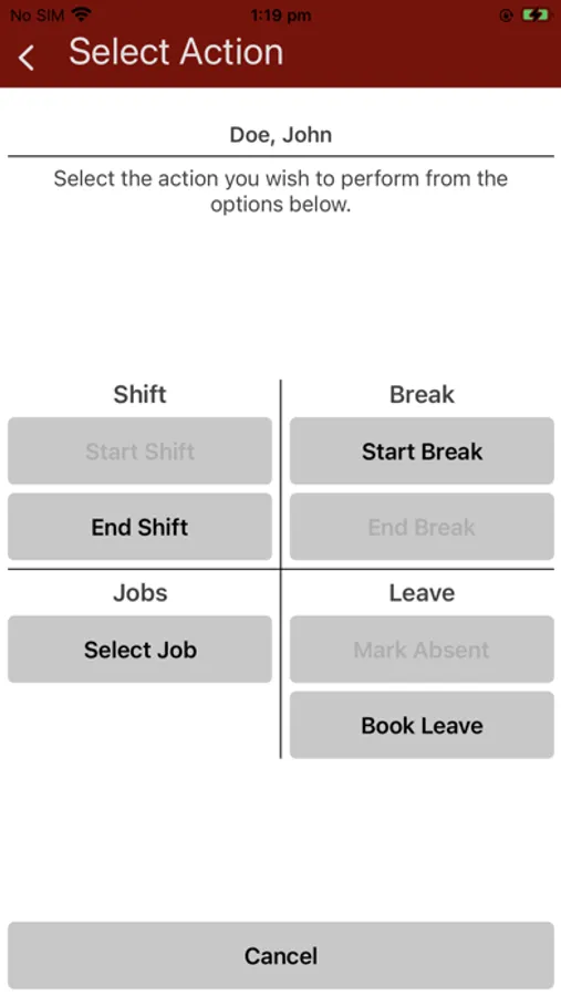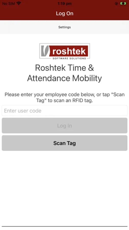Employees may log on to the Roshtek Attendance Mobility app using their employee code, or an RFiD key fob. The system may also be configured to allow employee selection from a list, if desired.
