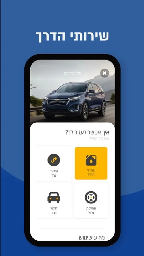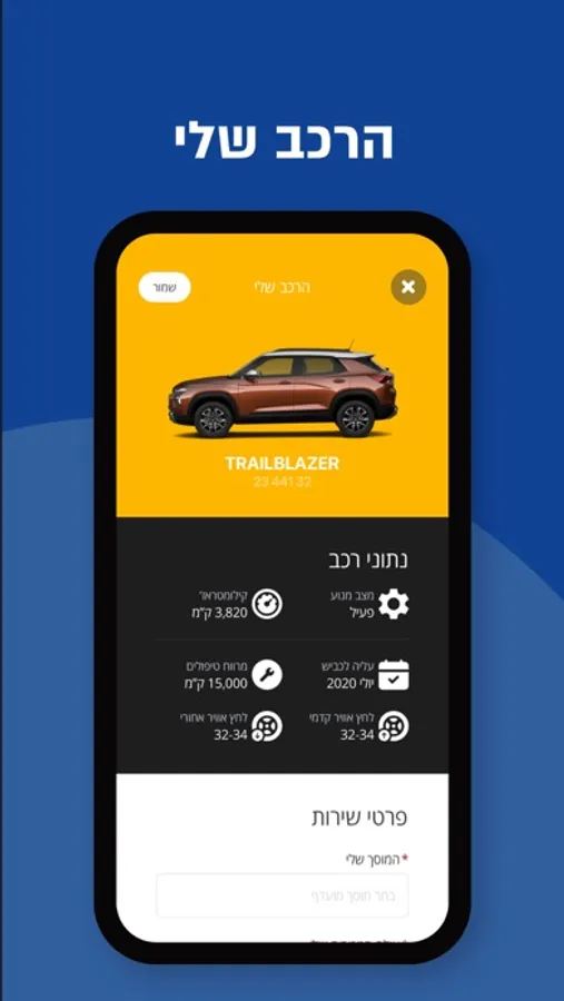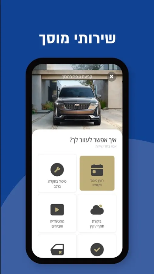 מערכת השירות שלנו באפליקציה הסלולרית משלבת את היכולת לתאם ביקור במרכזי השירות שלנו כשנוח לכם, קבלת הצעת מחיר לטיפול, שירותי שינוע למוסך, פתיחת קריאות שירותי דרך וחרום תוך מעקב ועדכוני סטטוס.