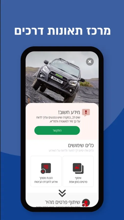 בנוסף, במקרה של תאונת דרכים האפליקציה שלנו כוללת אשף לדיווח תאונת דרכים לחברת הביטוח המותאמת לרגולציה של חברות הביטוח בישראל.