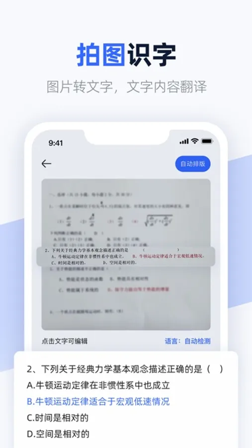 - 智能OCR文字识别,轻松提取课本、试卷、作业、板书中的文字!并对文字识别进行编辑、复制,或保存为Text、Word。可识别多种语言,辅助学习外语。