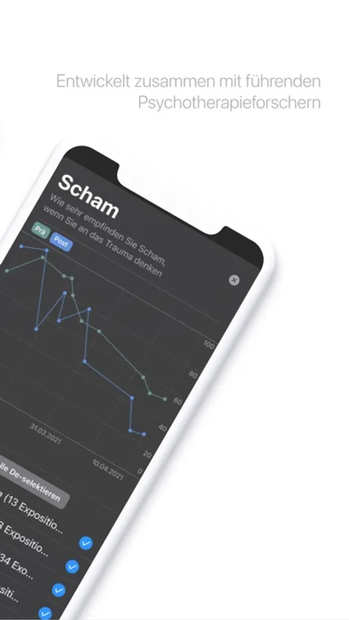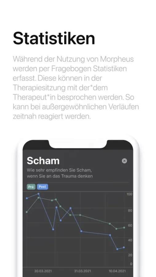 Morpheus hilft Therapeut*innen und Patient*innen stündlich und gesamtheitlich den Therapiefortschritt zu überwachen, indem eine Übersicht über Prä- und Post-Evaluationen dargestellt werden.