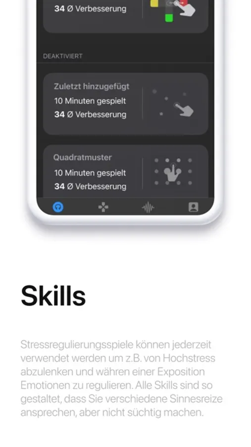 Die Stressregulierungsspiele sind digitale, interaktive Minispiele. Es werden verschiedene Sensoriken der Nutzer*innen angesprochen, zum Beispiel auditive, motorische, visuelle oder logische.