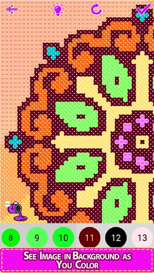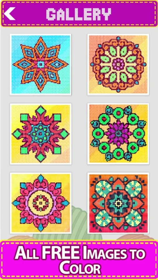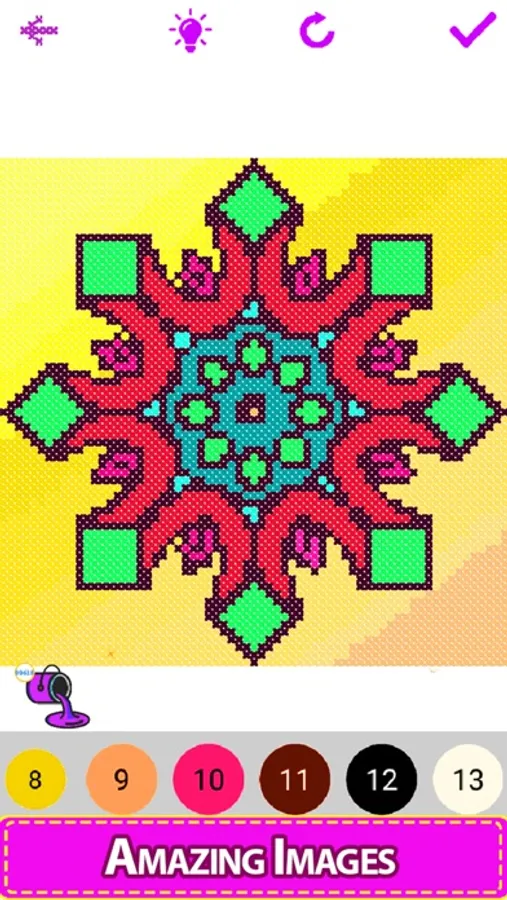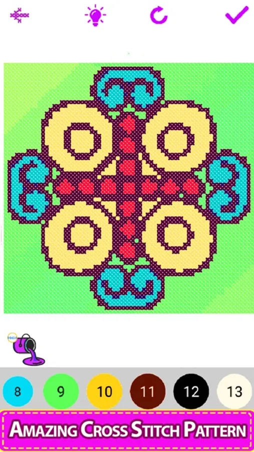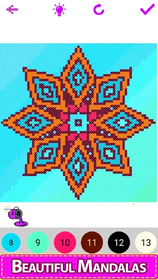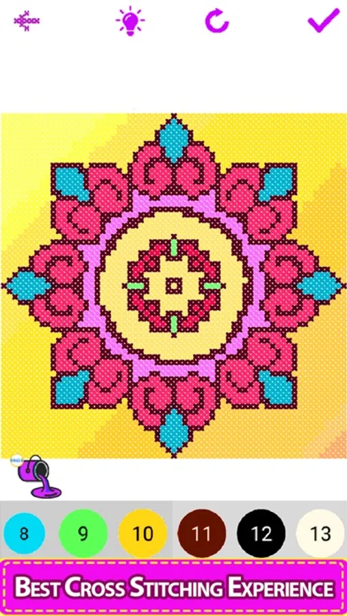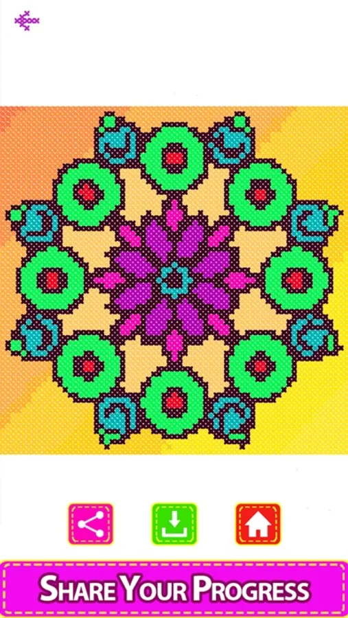 Enter the colorful world of the Cross Stitch coloring quest! A relaxing color by number game for all ages, with a huge selection of beautiful cross stitch and embroidery sewing patterns. Cross-Stitch mandala comes with hundreds of beautiful mandala designs and patterns to work with solids, glitters, and crayons. A Cross-Stitch art design comes to life as you build it up stitch by stitch.