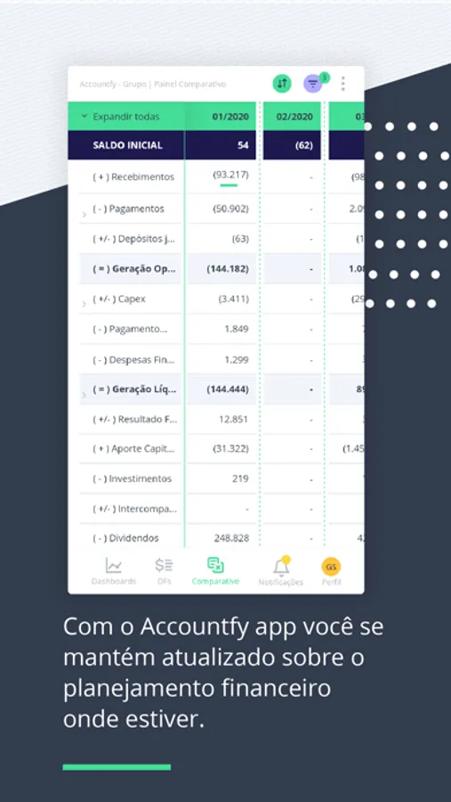 In the application it is possible to view your company’s financial information added by means of the web platform, enabling the collaboration and interaction between users, with notifications about the most recent changes and updates.