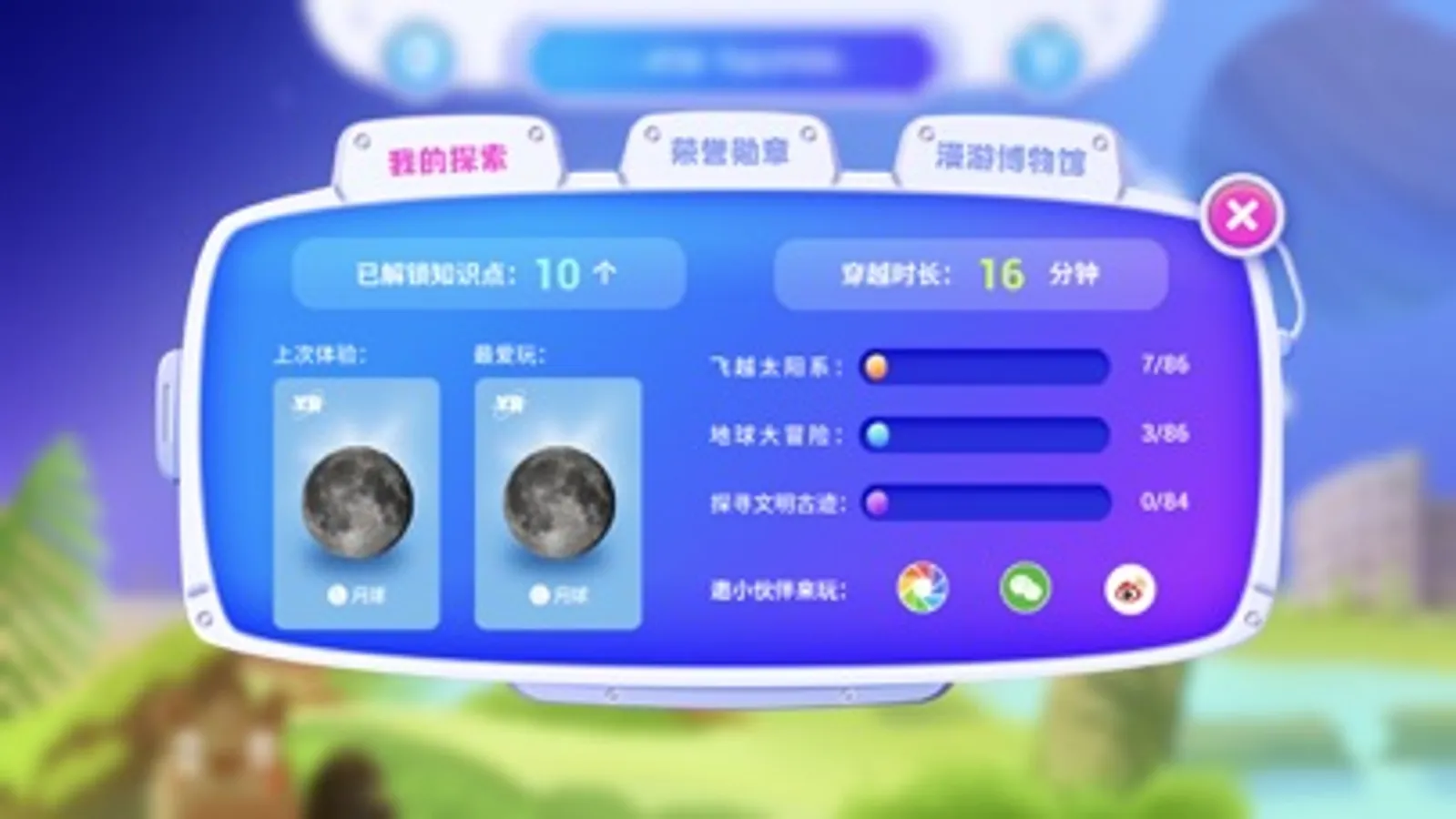 1.“我的探索”,孩子的专属学习报告,记录探索时长和最爱场景,更加客观了解孩子的兴趣爱好。